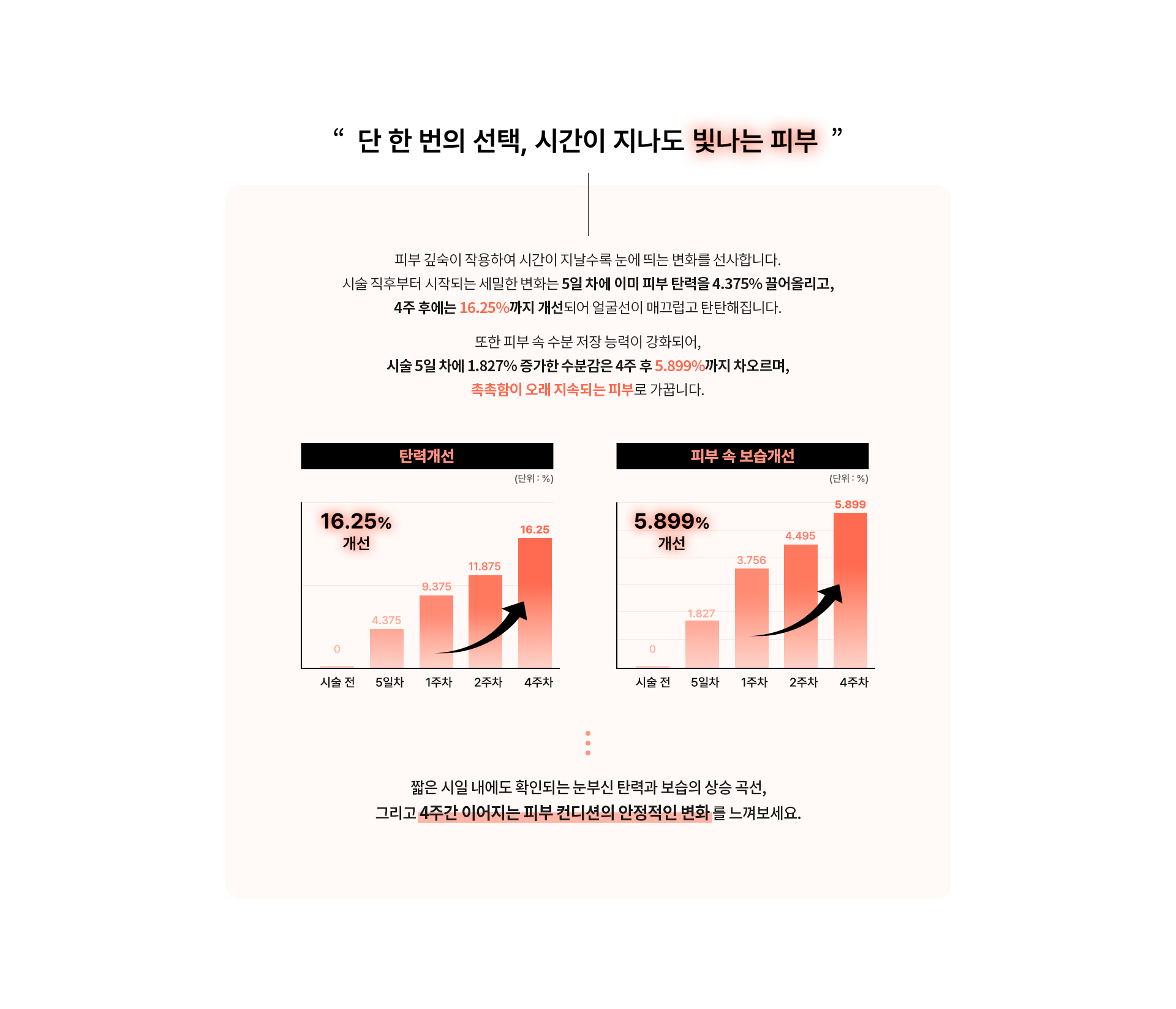 피부속 콜라겐과 엘라스틴을 포함하여, 근본적인 피부 개선에 도움을 줍니다.