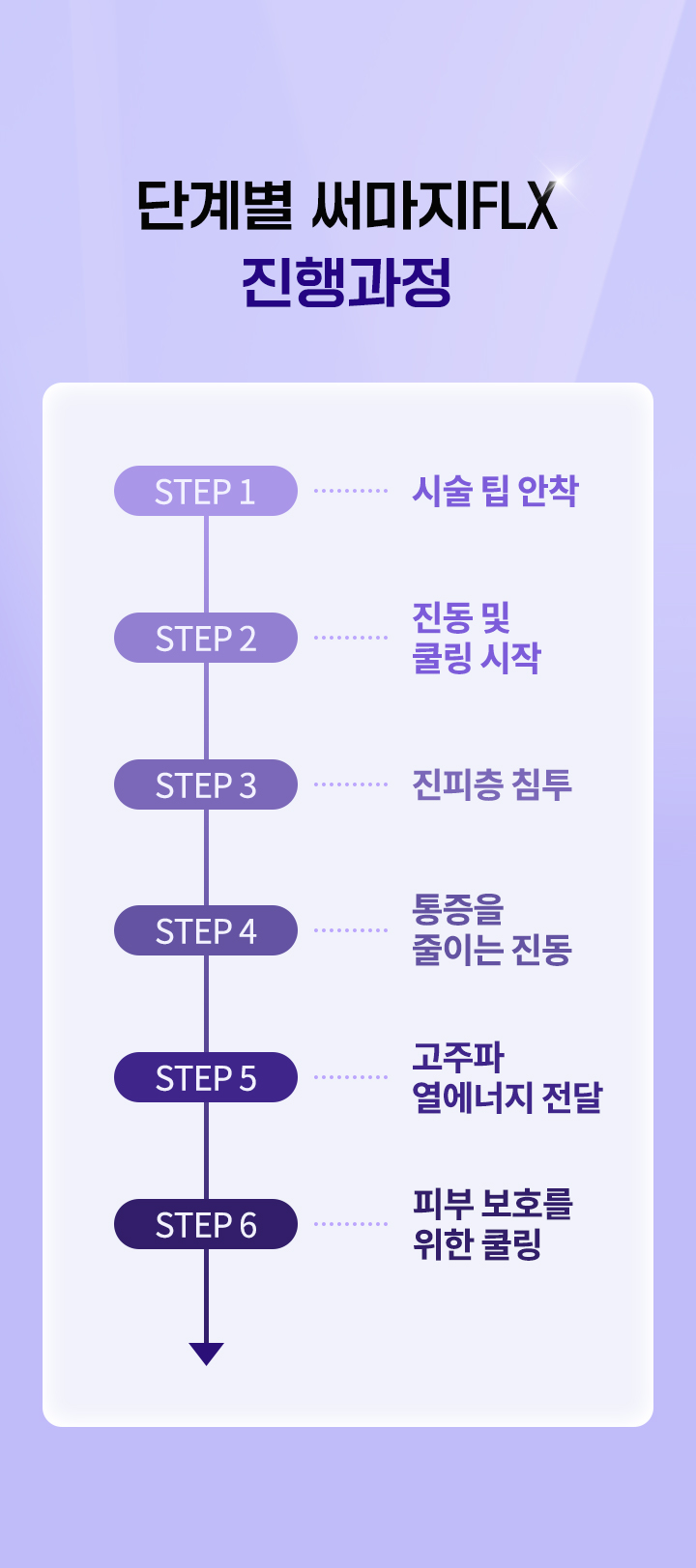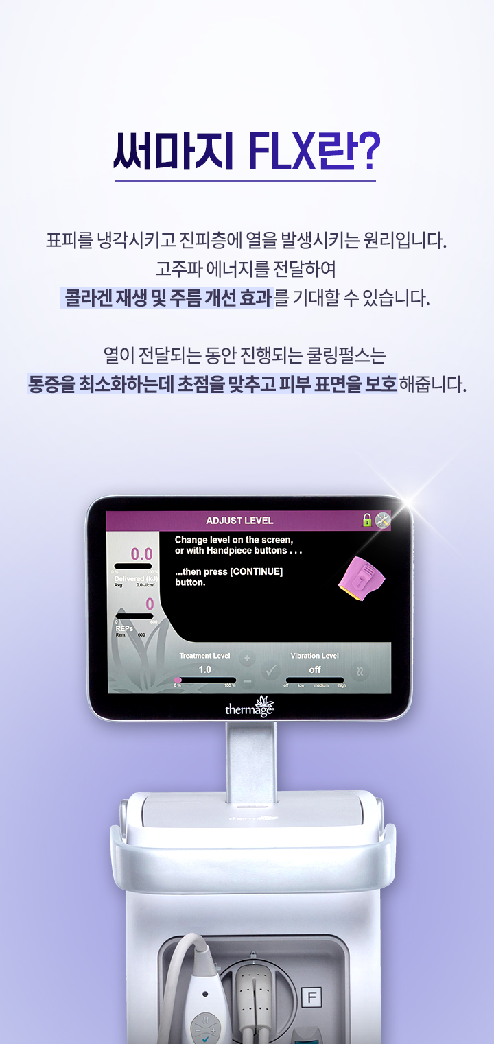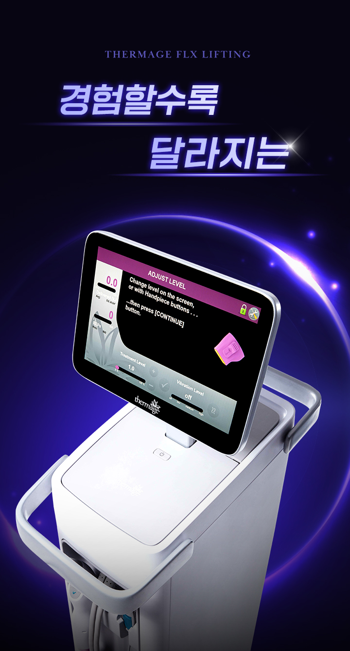 표피를 냉각시키고 진피층에 열을 발생시키는 원리입니다. 고주파 에너지를 전달하여 콜라겐 재생 및 주름 개선 효과를 기대할 수 있습니다. 열이 전달되는 동안 진행되는 쿨링펄스는 통증을 최소화하는데 초점을 맞추고 피부 표면을 보호해줍니다.