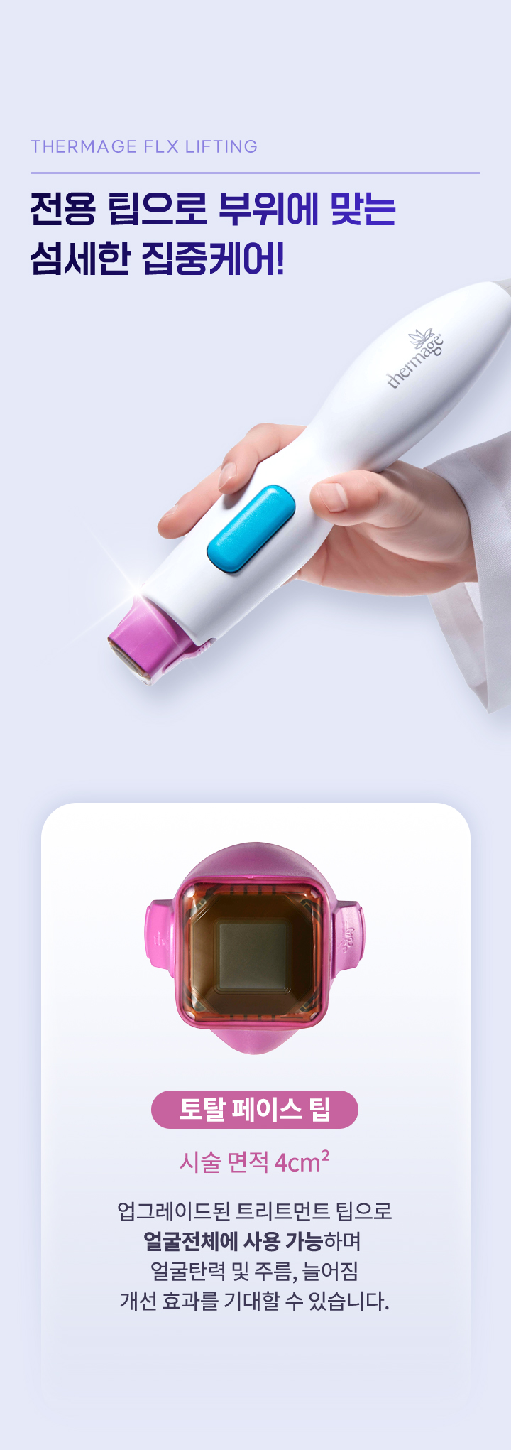 업그레이드된 트리트먼트 팁으로 얼굴전체에 사용 가능하며 얼굴탄력 및 주름, 늘어짐 개선 효과를 기대할 수 있습니다.